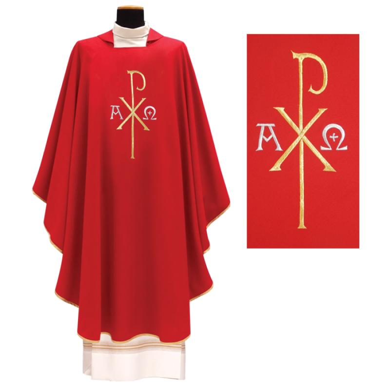 Červený ornát - zdobený výšivkou.Štóla je súčasťou balenia.Olemované zlatou stuhou.Farba látky: červená. Bez podšívky, látka PES.Šírka:160cmDĺžka:125cm.