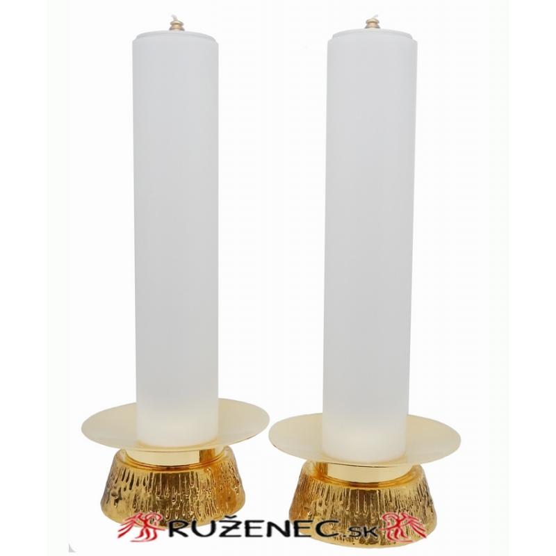 Oltářní souprava. Pár plastových olejových svíček /5cmx25cm/ s pozlacenými svícny - výška 30cm.