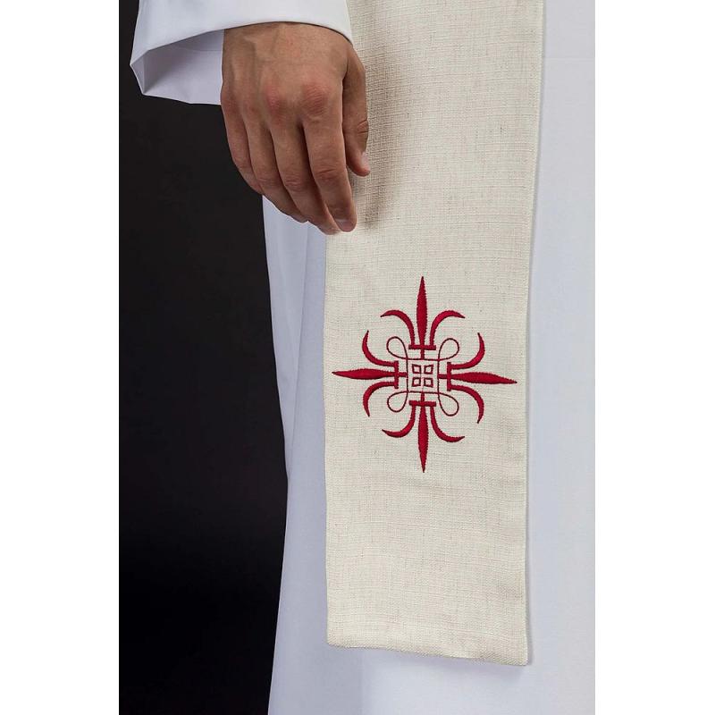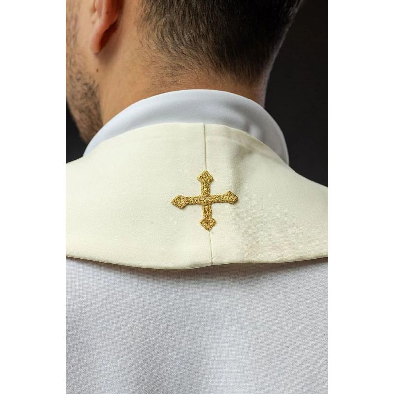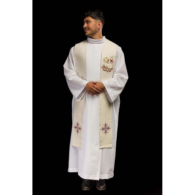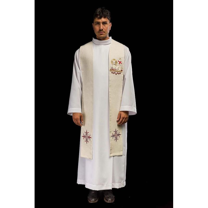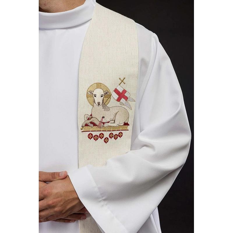 Jednostranná stule vyrobená z vysoce kvalitní hladké tkaniny, zdobená bohatou výšivkou se symbolem Beránka Božího. šířka štoly 16cm. Délka štoly: 130cm. Látka: 80%PES + 20%bavlna.