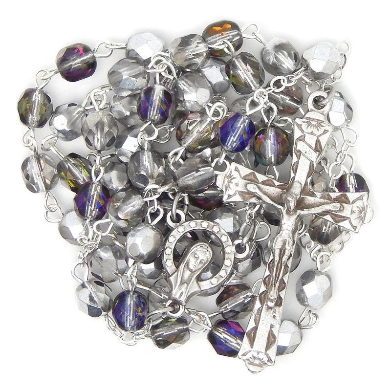 Růženec z broušených transparentních ohňovek s modro stříbrnou porchovou úpravou velikosti 6mm. Délka po obvodu 61cm, při zavěšení cca 48cm - LZE přetáhnout přes hlavu! Velikost ohňovek 6mm. Ruční práce.