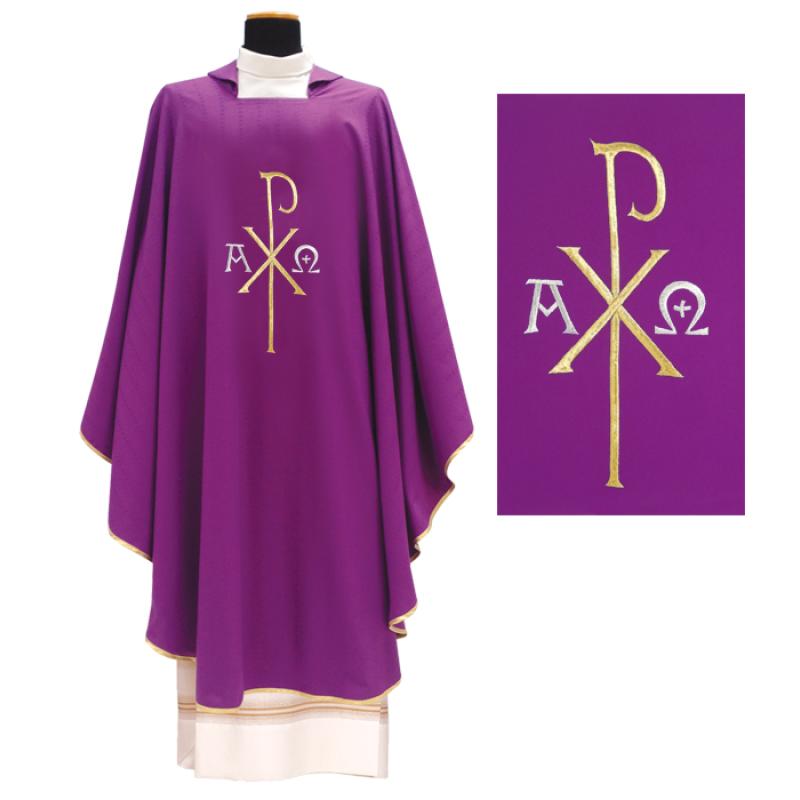Fialový ornát - zdobený výšivkou.Štóla je súčasťou balenia.Olemované zlatou stuhou.Farba látky: fialová. Bez podšívky, látka PES.Šírka:160cmDĺžka:125cm.