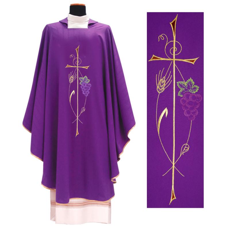 Fialový ornát - zdobený výšivkou.Štóla je súčasťou balenia.Olemované zlatou stuhou.Farba látky: fialová. Bez podšívky, látka PES.Šírka:160cmDĺžka:125cm.