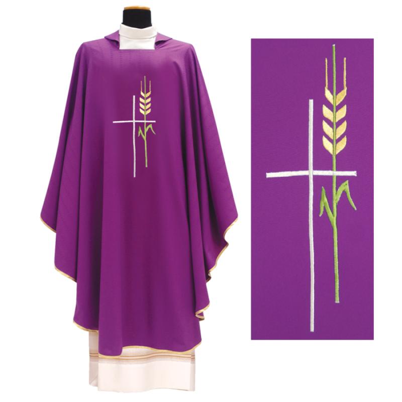 Fialový ornát - zdobený výšivkou.Štóla je súčasťou balenia.Olemované zlatou stuhou.Farba látky: fialová. Bez podšívky, látka PES.Šírka:160cmDĺžka:125cm.