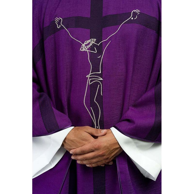 Ornát vyrobený z vysoko kvalitnej tkaniny s viditeľnou textúrou, zdobený výšivkou s motívom ukrižovania Ježiša na kríži. Štóla je súčasťou balenia. Farba látky: fialová Bez podšívky, látka: 100%POLYESTER. Šírka:144cm Dĺžka:135cm.