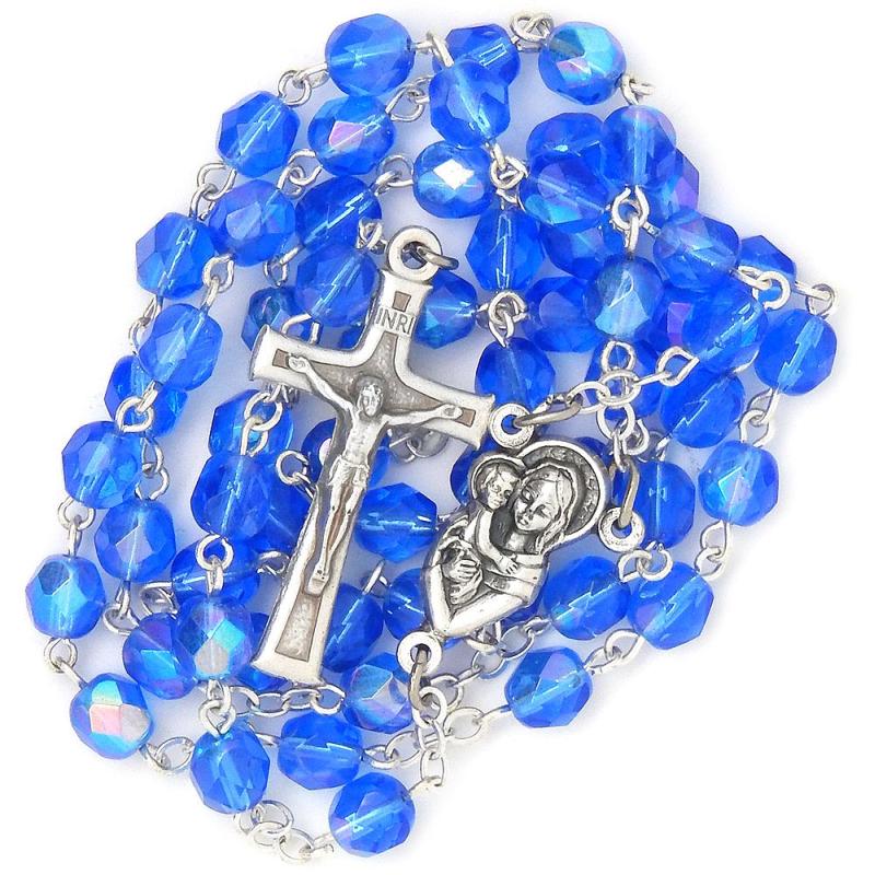 Ruženec z brúsených modrých ohňoviek veľkosti 6mm.Celková dĺžka: 48cm, obvod 61cm.