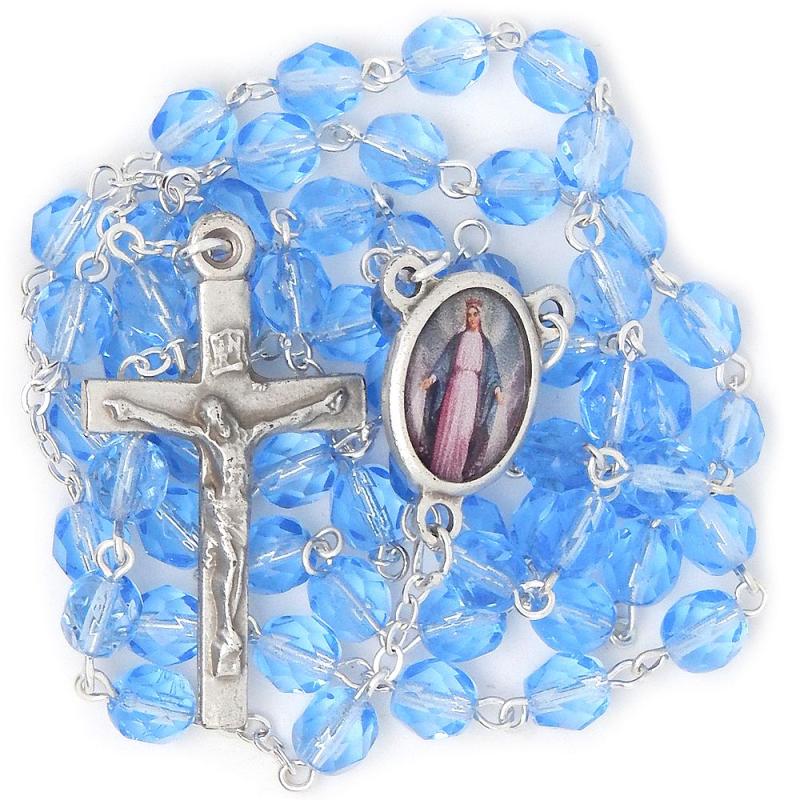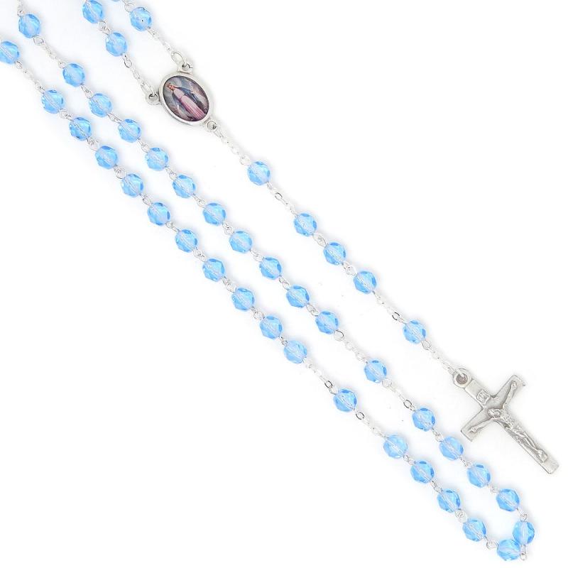 Ruženec z brúsených modrých ligotavých ohňoviek veľkosti 6mm.Celková dĺžka: 48cm, obvod 61cm.